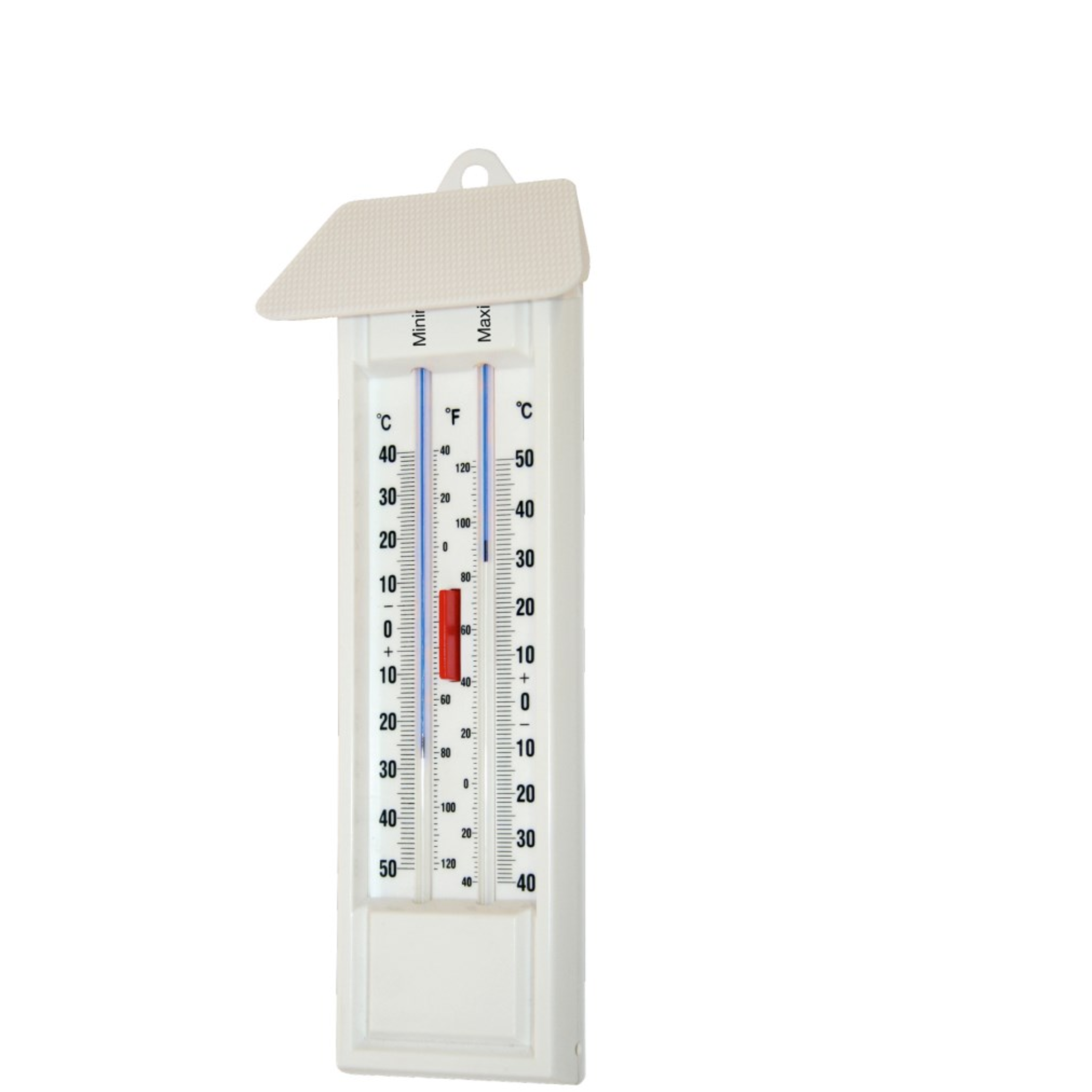 Colocar el termómetro en posición vertical, en un lugar protegido de la luz solar directa. Leer las temperaturas máxima y mínima marcadas por los indicadores.