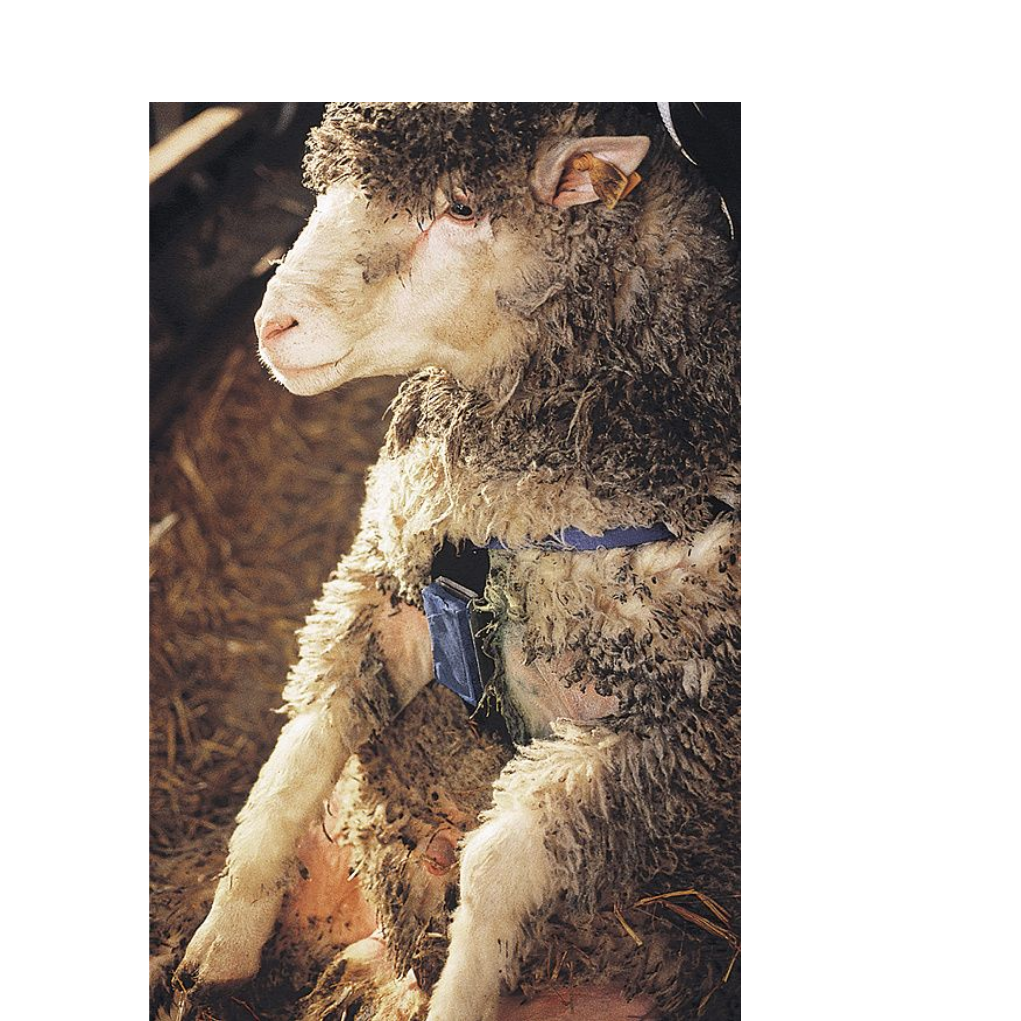 Fabricado con nailon resistente, el arnés ofrece una gran durabilidad y resistencia al desgaste, ideal para soportar las condiciones habituales de las explotaciones ganaderas. En la imagen se puede observar el arnés colocado firmemente en un carnero, con un diseño ergonómico que se adapta perfectamente al cuerpo del animal gracias a sus correas ajustables.