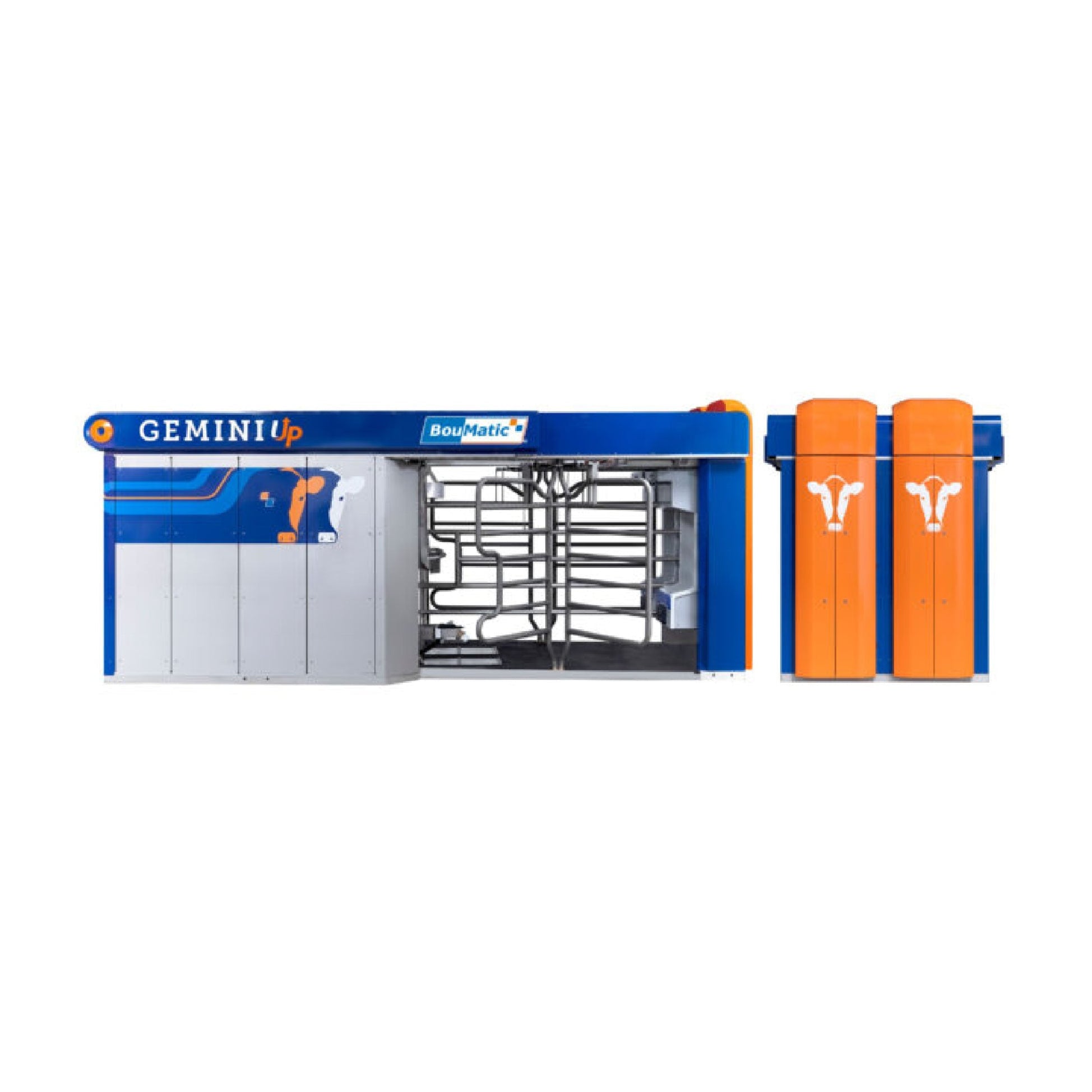 El robot de doble caja Gemini UP es un robot de ordeño compacto equipado con dos puestos, uno al lado del otro. Tiene un brazo robótico que ordeña dos vacas simultáneamente entre las patas traseras.