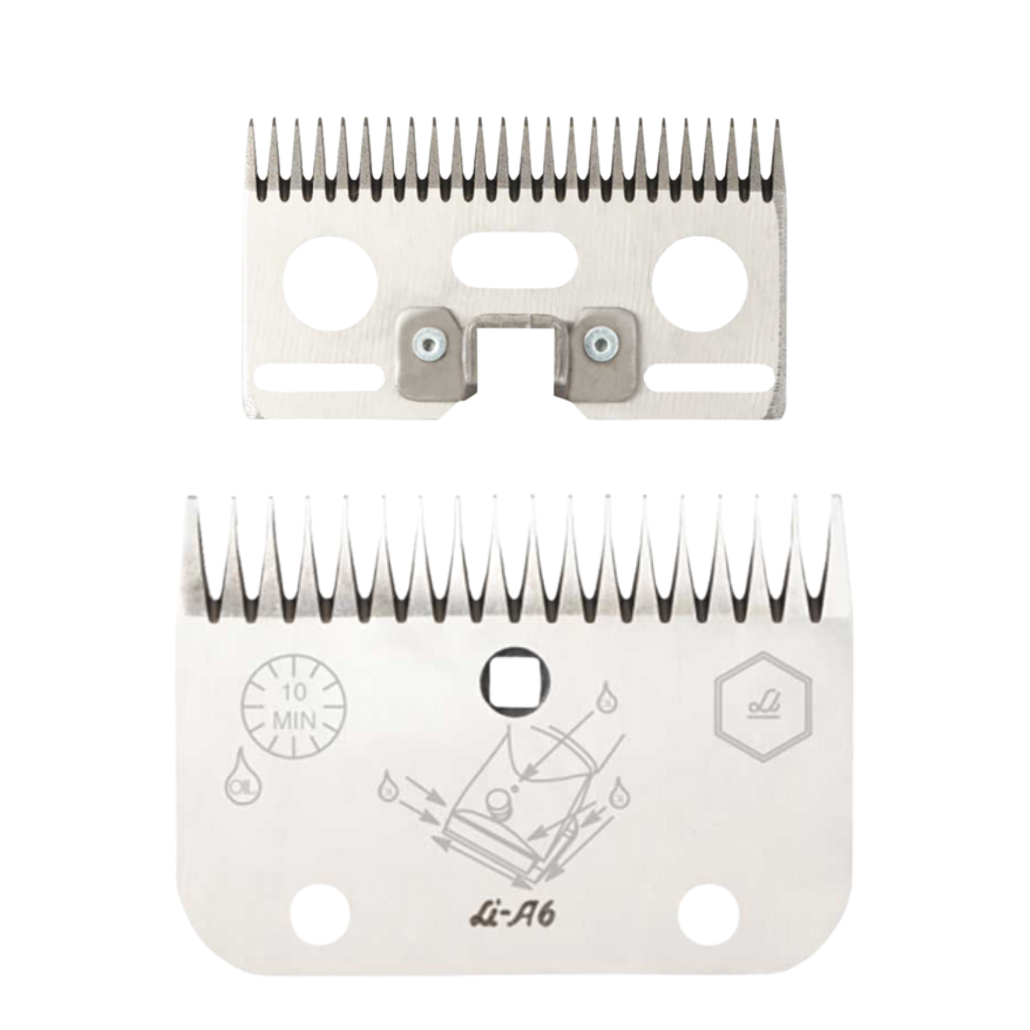 Juego de peine y cuchilla Modelo A-6 para vacas (LC A 6 – 3 mm): conjunto compuesto por peine de 24 dientes y cuchilla de 18 dientes, diseñado para una altura de corte ajustada entre 0,5 y 3 mm. Fabricado en acero de alta calidad, con acabado de alta precisión que favorece un corte uniforme y seguro. Compatible con máquinas Super 3000 y Combi Liscop, especialmente indicado para animales con nivel de limpieza normal. Permite afilado frecuente sin perder rendimiento gracias a su resistencia estructural.