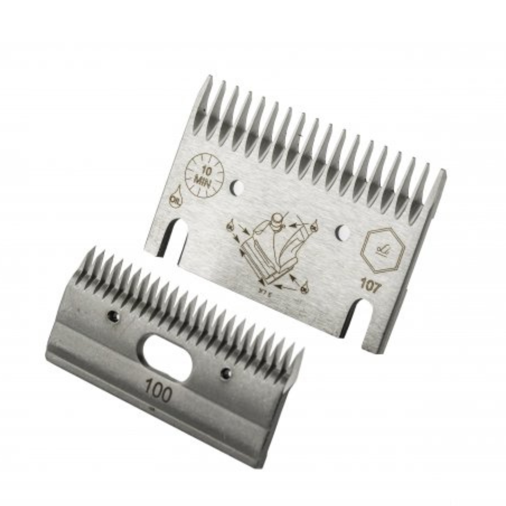El set peine y cuchilla Type 107 destaca por su diseño robusto y funcional, ideal para profesionales que necesitan una herramienta capaz de mantener un rendimiento constante en condiciones adversas. Gracias a su peine con menor número de dientes, permite una mejor penetración en pelajes densos o sucios, evitando atascos y asegurando un trabajo fluido. Es especialmente recomendado para vacuno, aunque también puede utilizarse en otros animales como equinos o ovinos, cuando el estado del pelaje requiere un equipo más resistente.