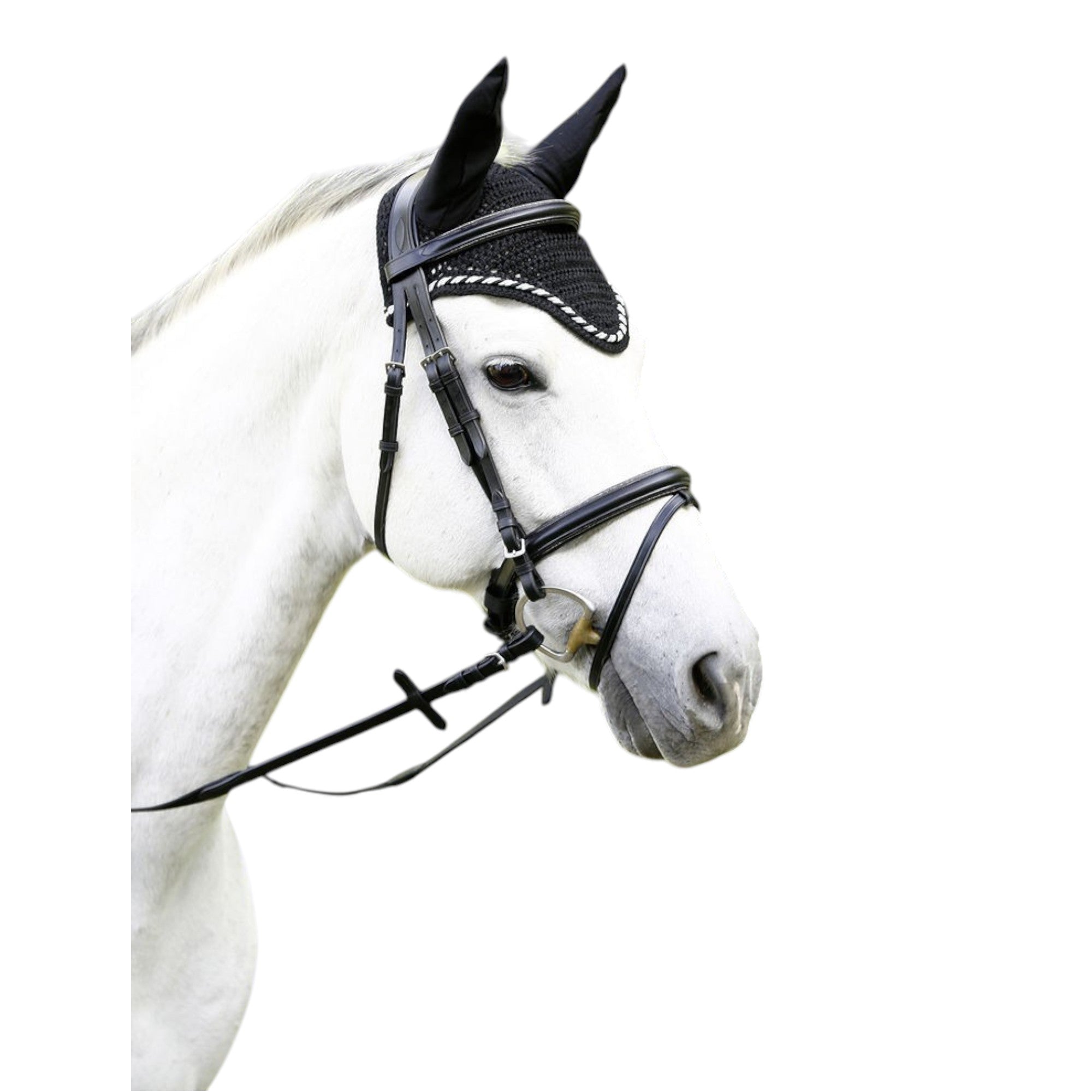 Colocar sobre la cabeza del caballo, asegurando que las orejas queden dentro de las secciones elásticas para protegerlas de insectos.