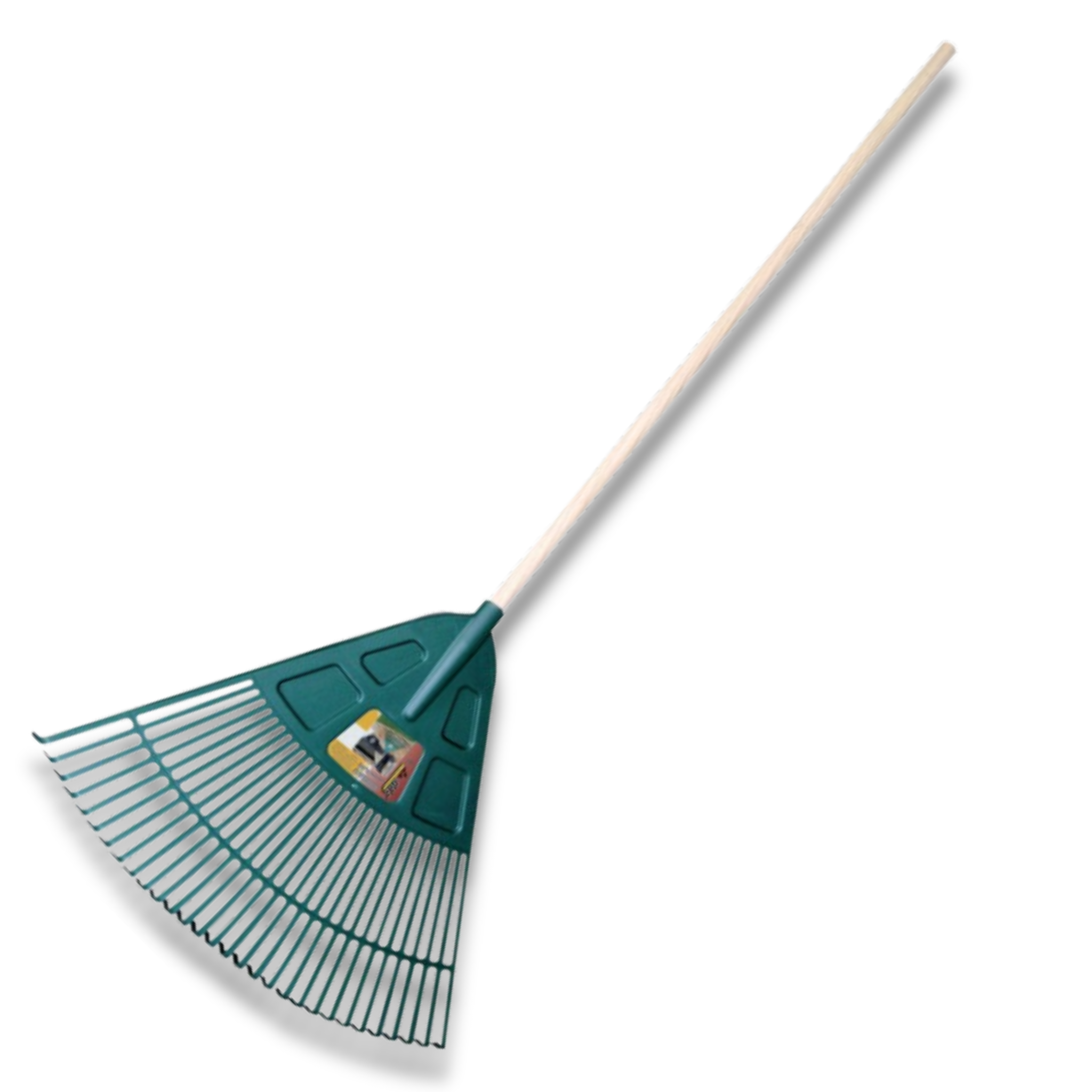 Rastrillo de tipo abanico ideal para recolectar hojas secas, pasto cortado y residuos ligeros del jardín. Su diseño triangular y las púas plásticas redondeadas se adaptan fácilmente a la superficie del terreno, permitiendo una recolección eficiente sin dañar el césped.
