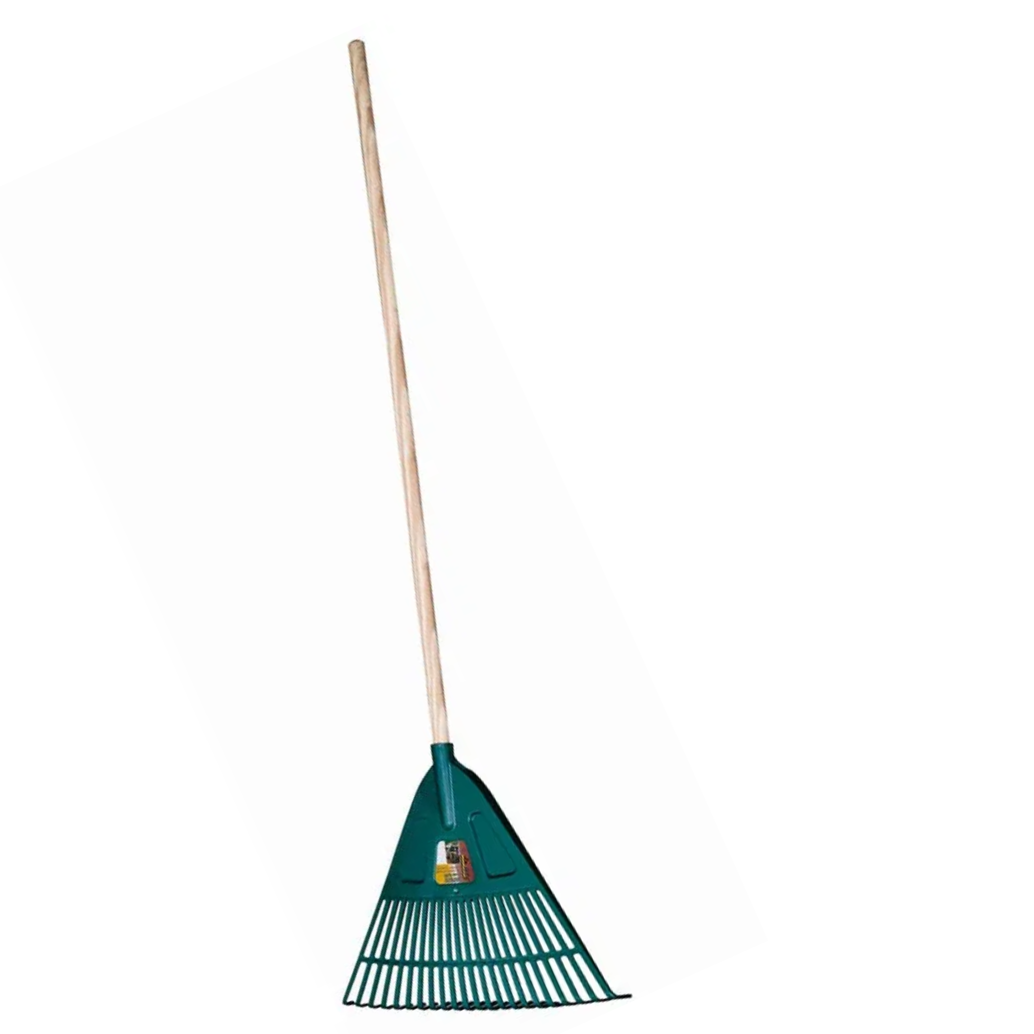 Rastrillo de tipo abanico ideal para recolectar hojas secas, pasto cortado y residuos ligeros del jardín. Diseño triangular más compacto, ideal para espacios reducidos y maniobrabilidad en áreas con obstáculos. Las púas redondeadas se adaptan al terreno sin dañarlo.