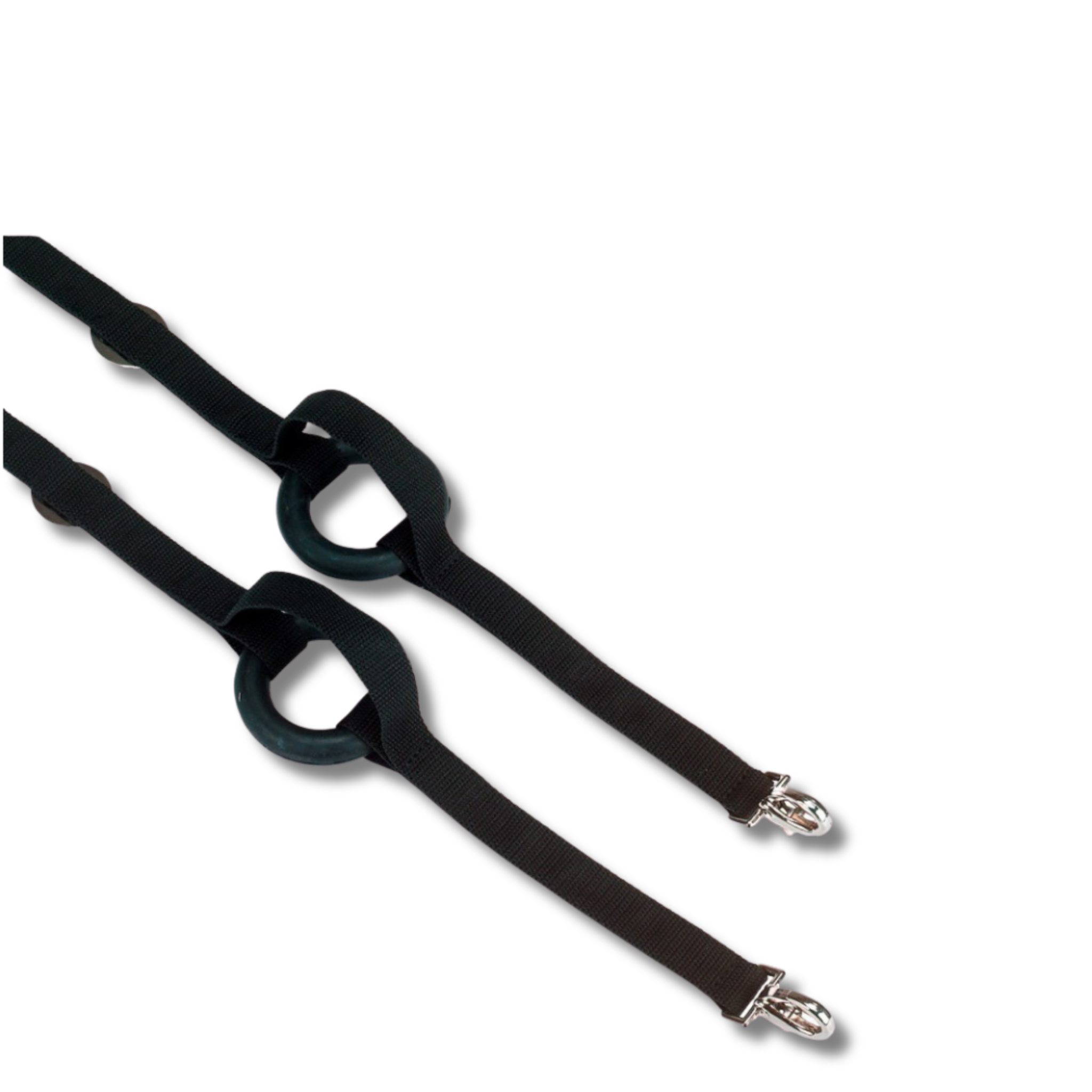 Colocar los mosquetones en los anillos laterales del filete o cabezada. Usar durante el entrenamiento para limitar el movimiento excesivo del caballo y mejorar la respuesta a las ayudas.