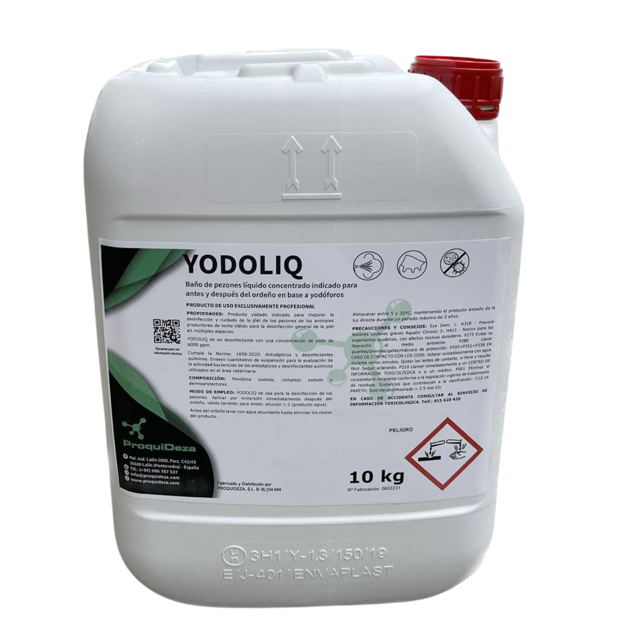 Es un baño de pezones líquido de uso profesional presentado en bidones de 10 kg y 20 kg, formulado para aplicación directa puro por inmersión o pulverización. Contiene 6.000 ppm de compuestos iodados (povidona yodada) con acción higienizante de amplio espectro, incorporando agentes dermoprotectores no irritantes que cuidan la piel del pezón y favorecen su hidratación. Su pH 5,0 respeta el equilibrio natural de la piel, ayudando a mantener la integridad cutánea y reduciendo el riesgo de irritaciones. Producto listo para usar, sin necesidad de dilución, ideal para protocolos de pre-dipping y post-dipping en explotaciones lecheras.